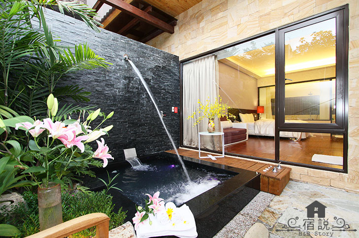 在礁溪這一片寸土寸金的溫泉一級戰區中,民宿主人不惜砸下重金,買下一旁另一塊地,將房間打通,把兩小房合併裝潢成了一大房,讓民宿不再受限於家庭式房間的經營,每一位客人來到此地都能享受到大房間的舒適感。此外在房間外也有泡湯池,在私人的空間中,不必經過漫漫長路,也能在打開門就能看見,房外的湯池蒸氣騰騰的溫泉。
