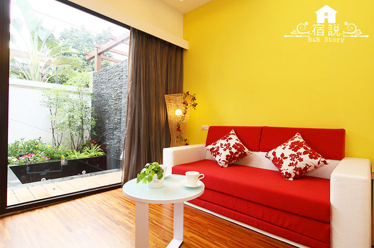 在礁溪這一片寸土寸金的溫泉一級戰區中,民宿主人不惜砸下重金,買下一旁另一塊地,將房間打通,把兩小房合併裝潢成了一大房,讓民宿不再受限於家庭式房間的經營,每一位客人來到此地都能享受到大房間的舒適感。此外在房間外也有泡湯池,在私人的空間中,不必經過漫漫長路,也能在打開門就能看見,房外的湯池蒸氣騰騰的溫泉。
