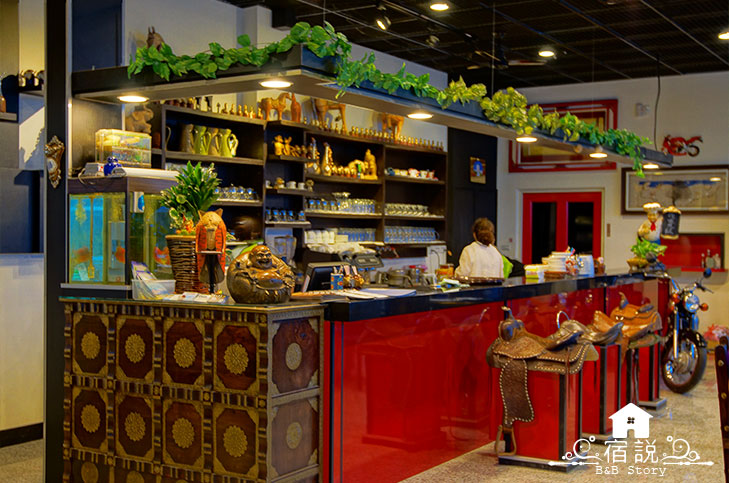 走進海角八邊,眼睛馬上被超酷的吧檯吸引走,從來沒有看過這麼有趣的馬鞍椅子,不能騎外面的迷你馬,可以來這裡試試一邊喝咖啡、下午茶,一邊享受”騎馬”的快感!還有,絕不能錯過老闆的收藏~不論是古色古香的裝飾品、帥氣拉風的重型機車、或者滿山遍野到處亂跑的動物們,絕對讓你有異時空結合的超強趣味喔!